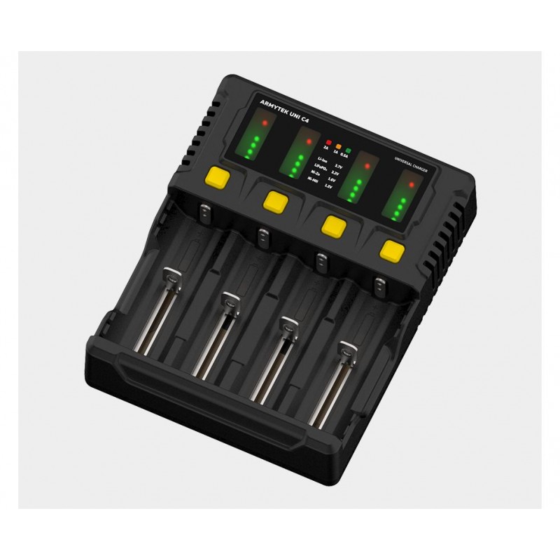 Uni C4 – универсальное зарядное устройство с интеллектуальным автоопределением типа аккумулятора, уровня заряда и оптимального тока. Одновременно заряжает до 4 аккумуляторов разного типа током до 2А. Отдельная кнопка для каждого канала обеспечивает простое ручное управление. Автомобильный адаптер в комплекте.
