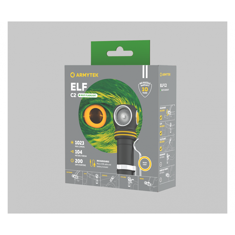 Стандартный для мультифонарей Armytek корпус позволяет использовать Elf C2 вместе с велокреплением ABM-01 для велопрогулок и с креплением на каску AHM-02 для индустриальных работ.
